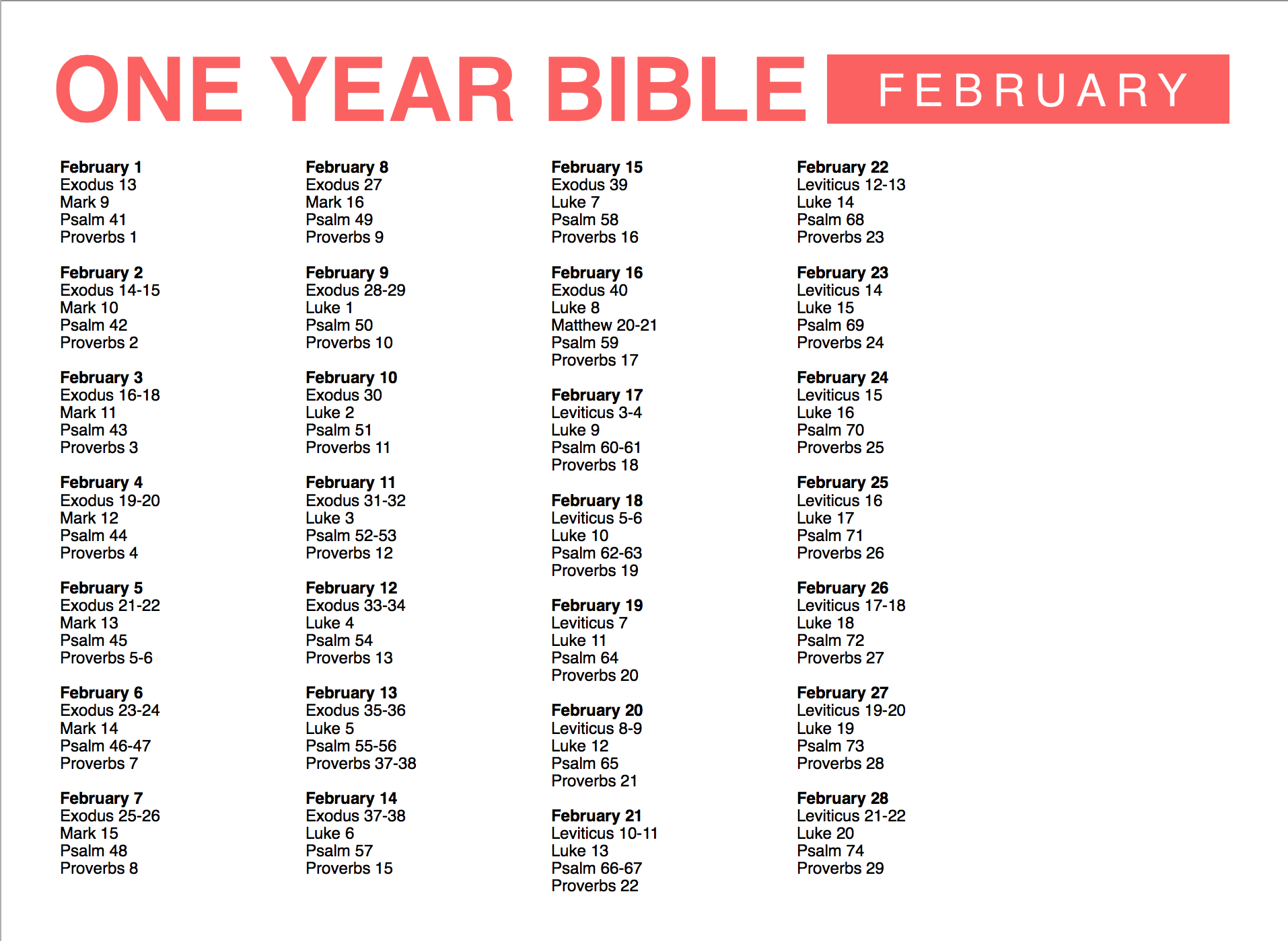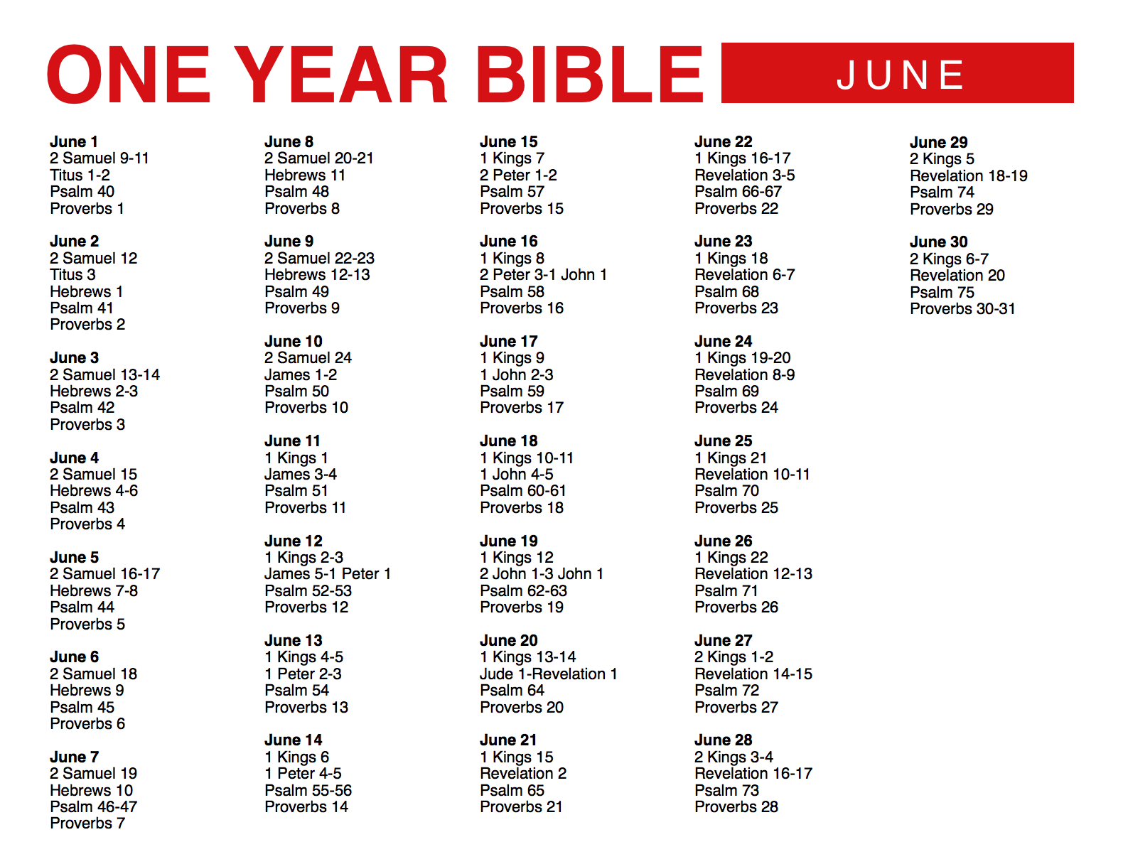We want to make reading God's Word as easy as possible. We believe that a balanced approach is the best approach, so this reading plan has scripture from the Old Testament, New Testament, a Psalms and a Proverb. Click the button each day to access your daily reading plan.